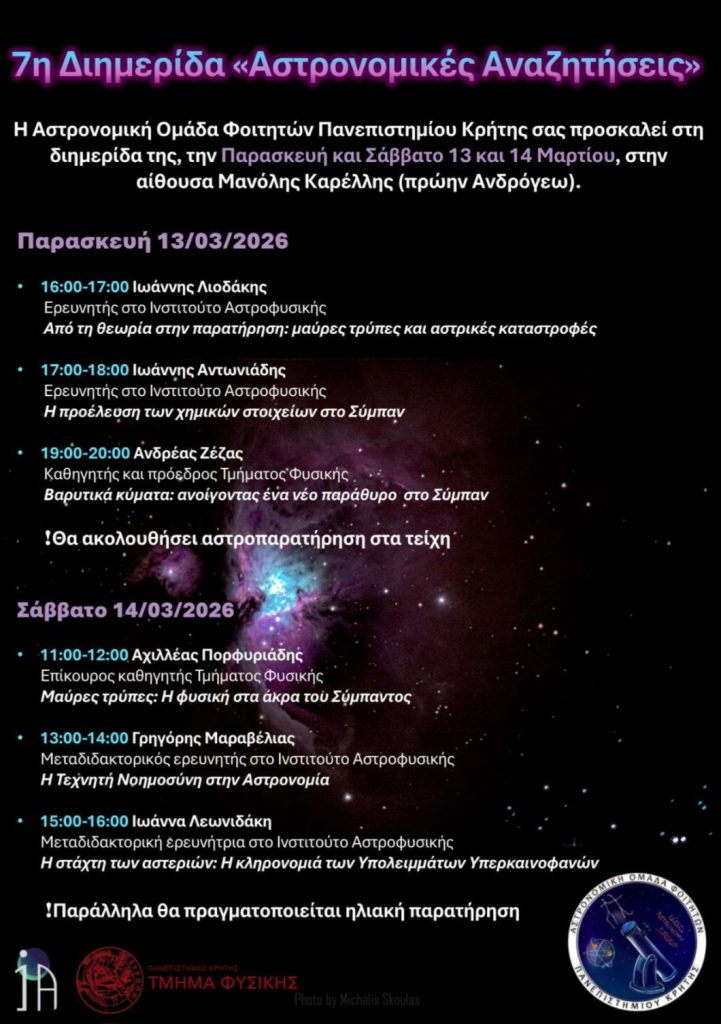 Η Αστρονομική Ομάδα Φοιτητών Πανεπιστημίου Κρήτης με χαρά σας προσκαλεί στην 7η διημερίδα της, με τίτλο « Αστρονομικές Αναζητήσεις », η οποία θα πραγματοποιηθεί την Παρασκευή και Σάββατο 13-14 Μαρτίου 2026 στην αίθουσα Μανόλης Καρέλλης (πρώην Ανδρόγεω, ανάμεσα στο Πολύκεντρο Ηρακλείου και στο ΚΕΠ).
